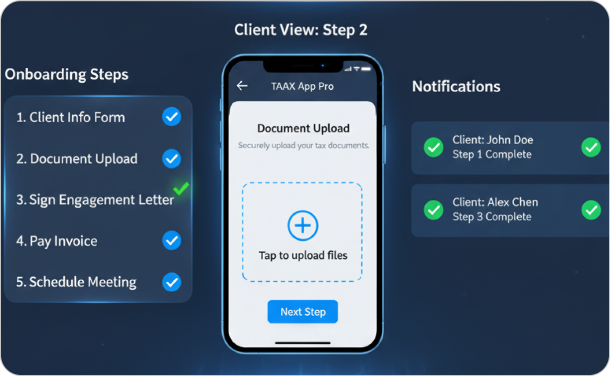 TAAX APP is your one-stop shop for success. Manage appointments, streamline workflows, connect with clients, and more – all from a single, user-friendly platform.