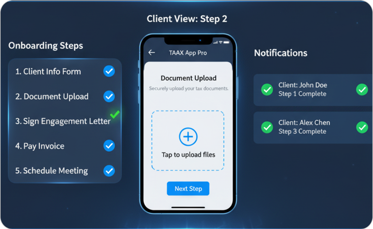 TAAX APP is your one-stop shop for success. Manage appointments, streamline workflows, connect with clients, and more – all from a single, user-friendly platform.