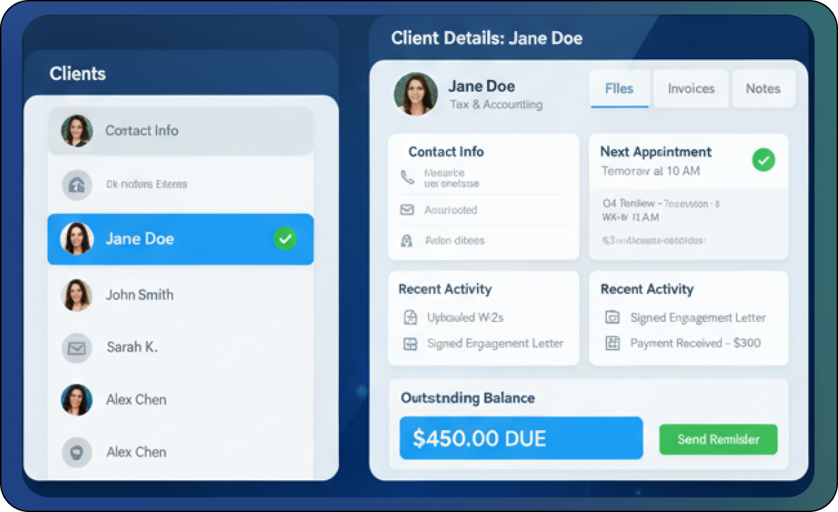 TAAX APP is your one-stop shop for success. Manage appointments, streamline workflows, connect with clients, and more – all from a single, user-friendly platform.